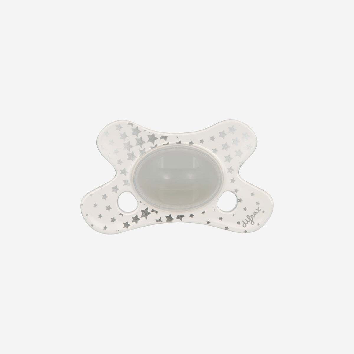 The Difrax Natural Pacifier 0-6 months fulfils your baby's need to suckle. The pacifier nozzle is round and convex-shaped, making it ideally suited for children who are able to turn the pacifier around in their mouth. The knob of the Glow in the Dark pacifier absorbs light and glows in the dark. The size of the shield and nozzle are specially adapted to new born babies and infants up to 6 months.